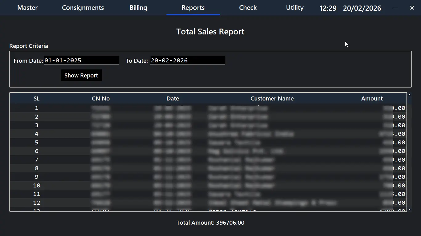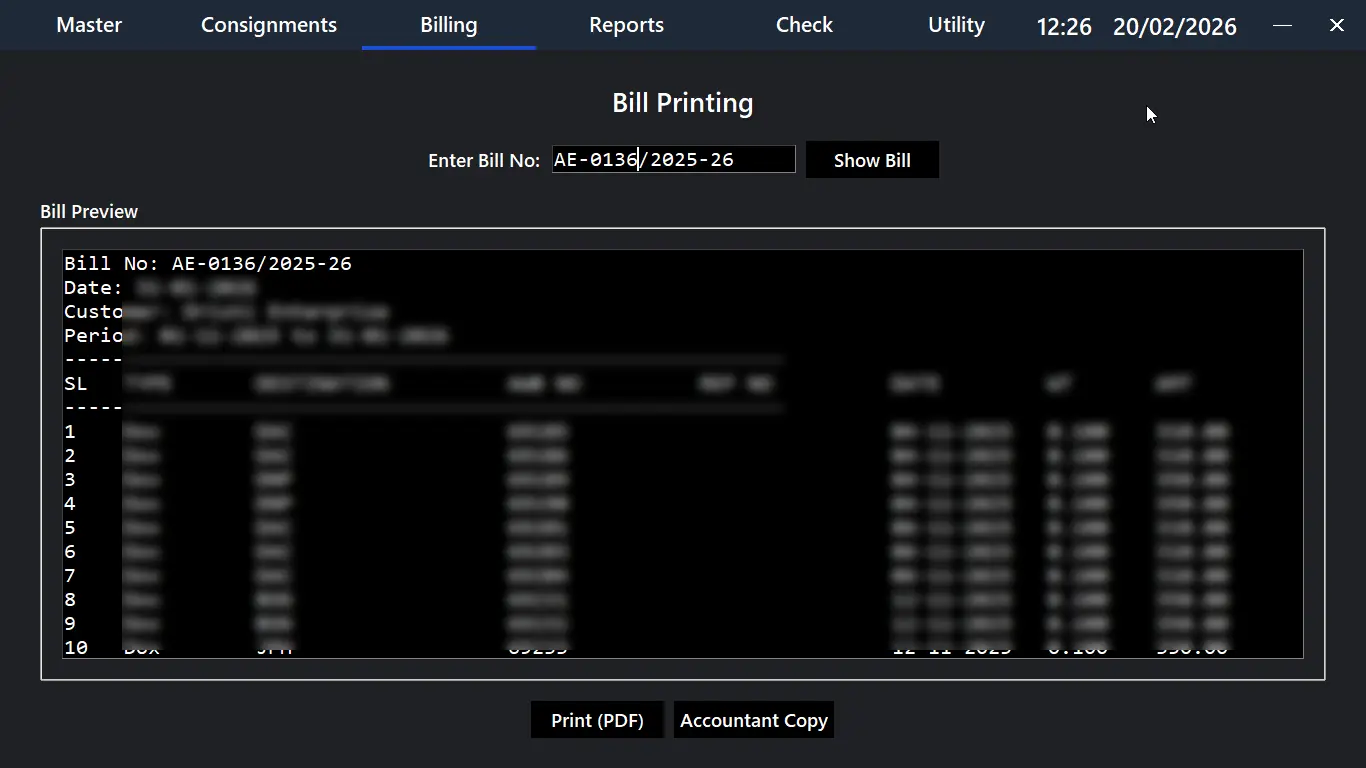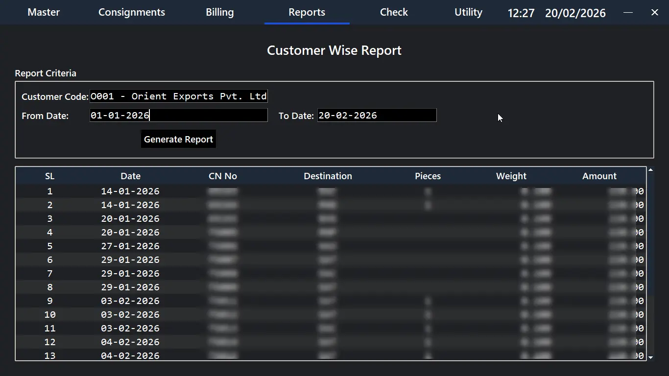 It seamlessly handles complex daily operations such as secure billing, comprehensive consignment management, robust master data storage, and complete invoice generation, ensuring all shipment records and financial calculations are accurately maintained in the generated logistics reports.